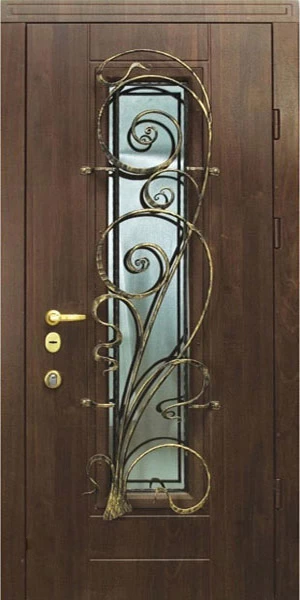Часто декорирование дверей ковкой используют вместе со стеклом, отделывают витражным узором, используют зеркальные вставки. Стекло в этом случае применяется антивандальное, с трудом поддающееся разрушению.